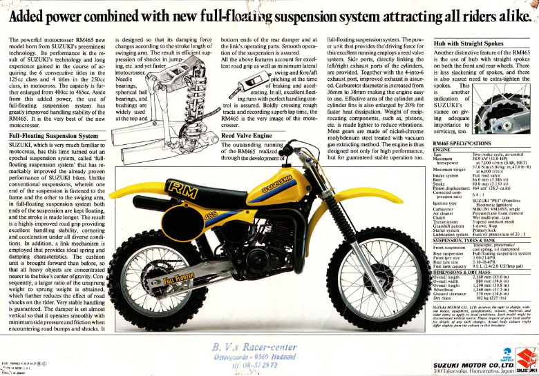 Современный мотоцикл Suzuki RM 465 – это мощная и динамичная машина, способная разгоняться до 100 км/ч. Его технические характеристики включают в себя мощный двигатель и переднюю телескопическую вилку. Suzuki RM 465 – это продукт компании Suzuki, известной на рынке мотоциклов с 1920 года. Выход на рынок состоялся в 1981 году, а цена составляла примерно 150 долларов США.