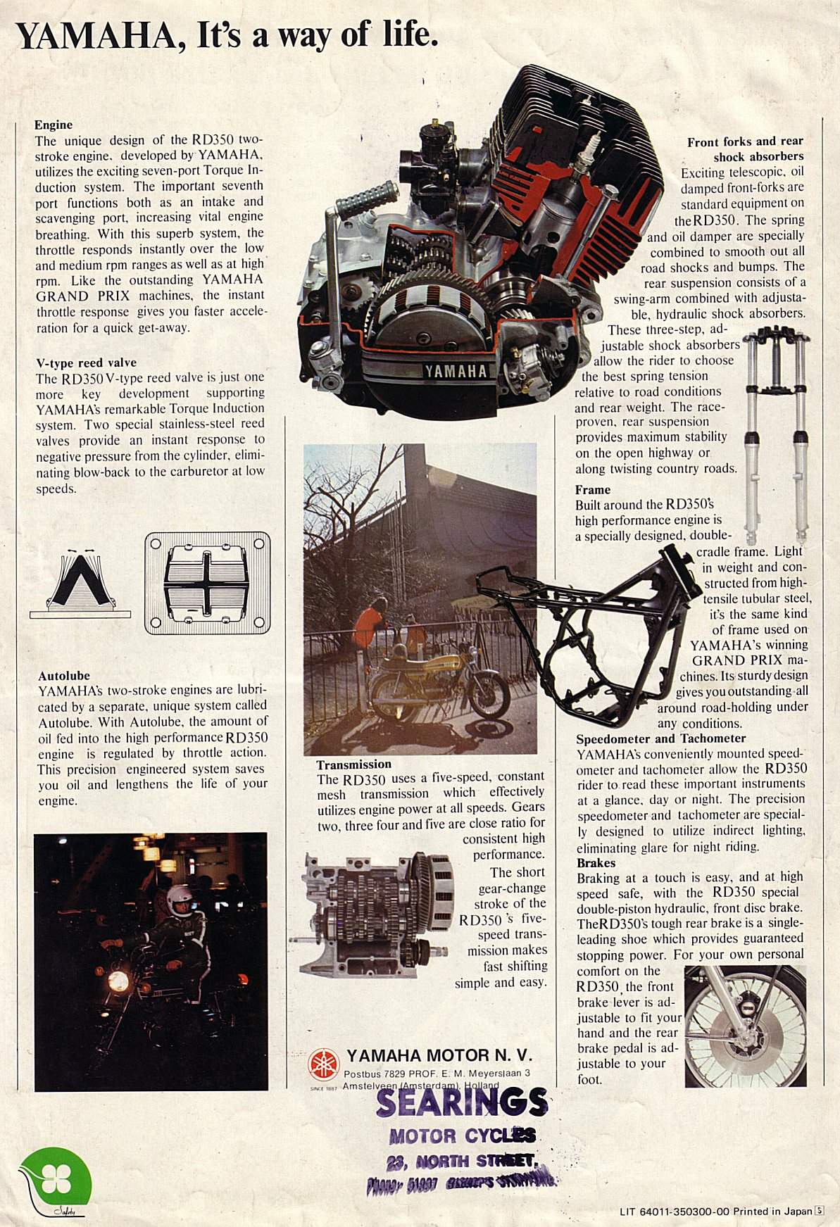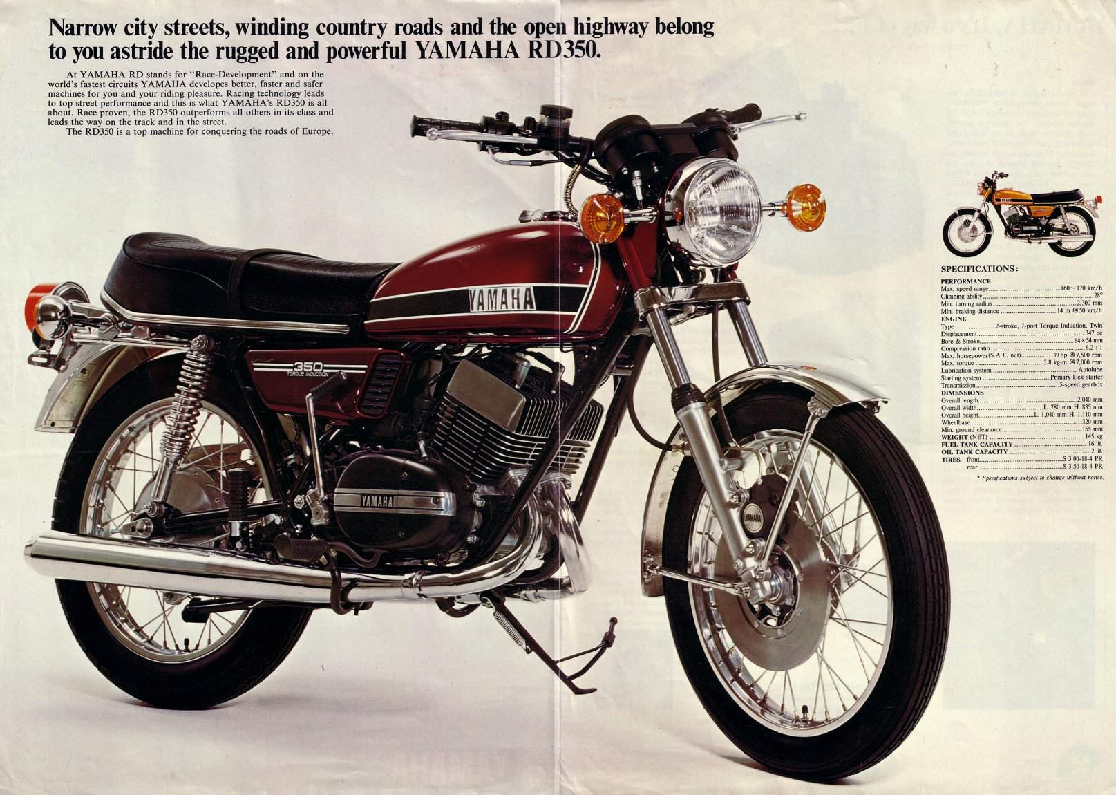 Мотоцикл Yamaha RD 350 1974 – классика внедорожного туризма. Этот двухтактный мотоцикл с параллельным горизонтальным двигателем мощностью 39 л.с. (28,5 кВт) при 7500 об/мин располагался на рынке с 1974 года. Yamaha RD 350 стоил 2 695 долларов США при выходе на рынок в 1974 году.